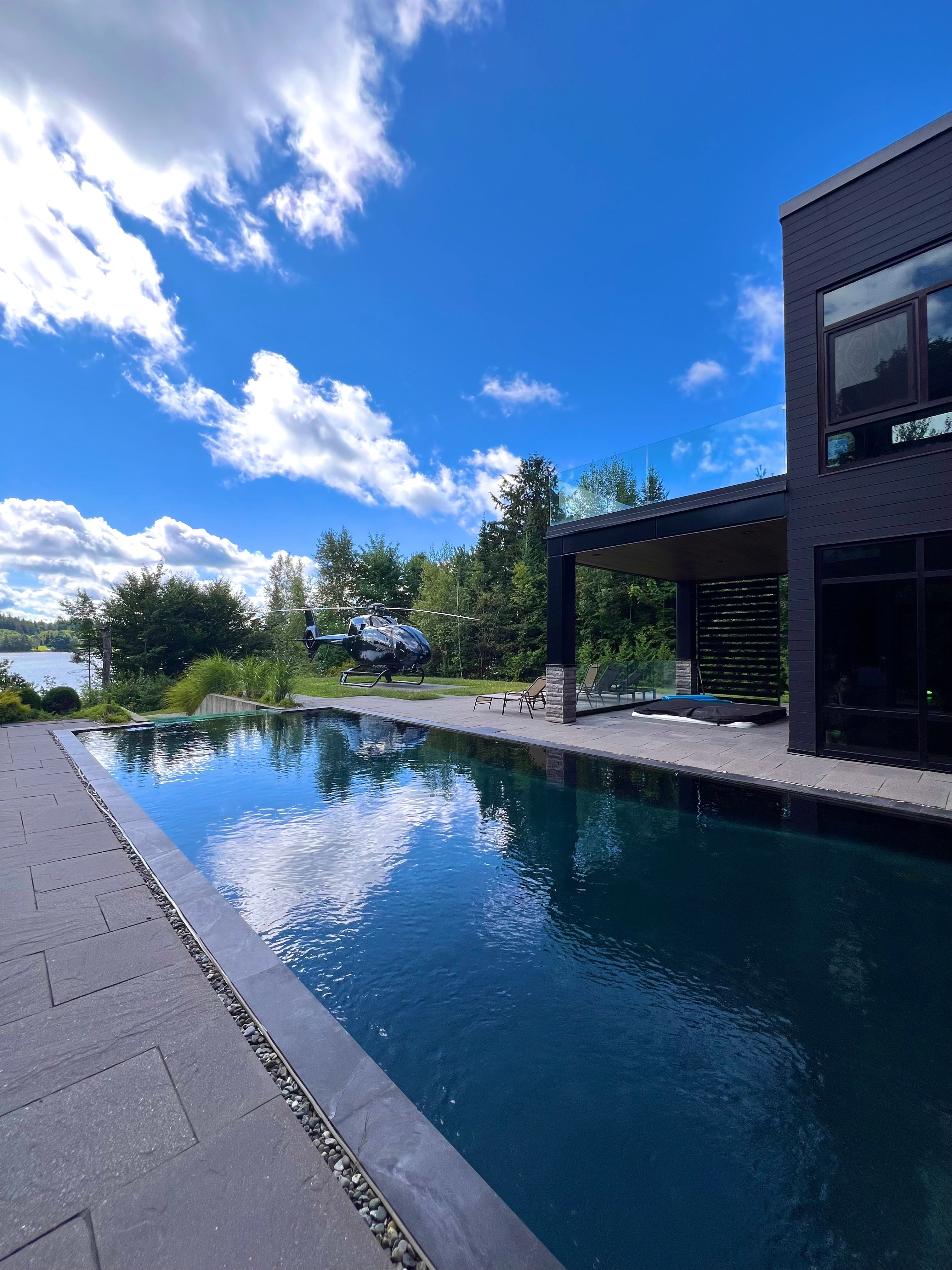 Voici l'une de nos magnifiques réalisations. Nous avons fourni les tuiles extérieures pour le contour de cette piscine, utilisant notre tuile espagnole haut de gamme "Nord Carbon".
